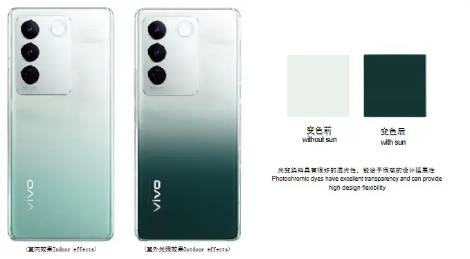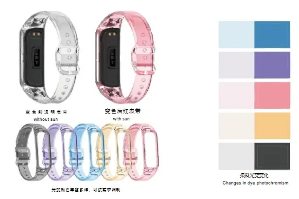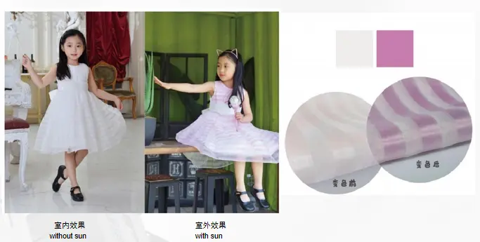 Materia photochromica pulveris materialis photochromicis confecta, involutione tingui photochromicorum in microcapsulis per processum speciales, quae industriam solis (ultraviolet), postquam irradiata a sole (ultraviolet), inde in mutationibus in structuram hypothetica effecta, in mutationibus absorptionis aequalitatum, inde colorum mutationes; Cum lux solis (ultraviolet) industria amissa est, ad pristinam structuram hypotheticam redit et pristinum colorem restituit. Proprium: